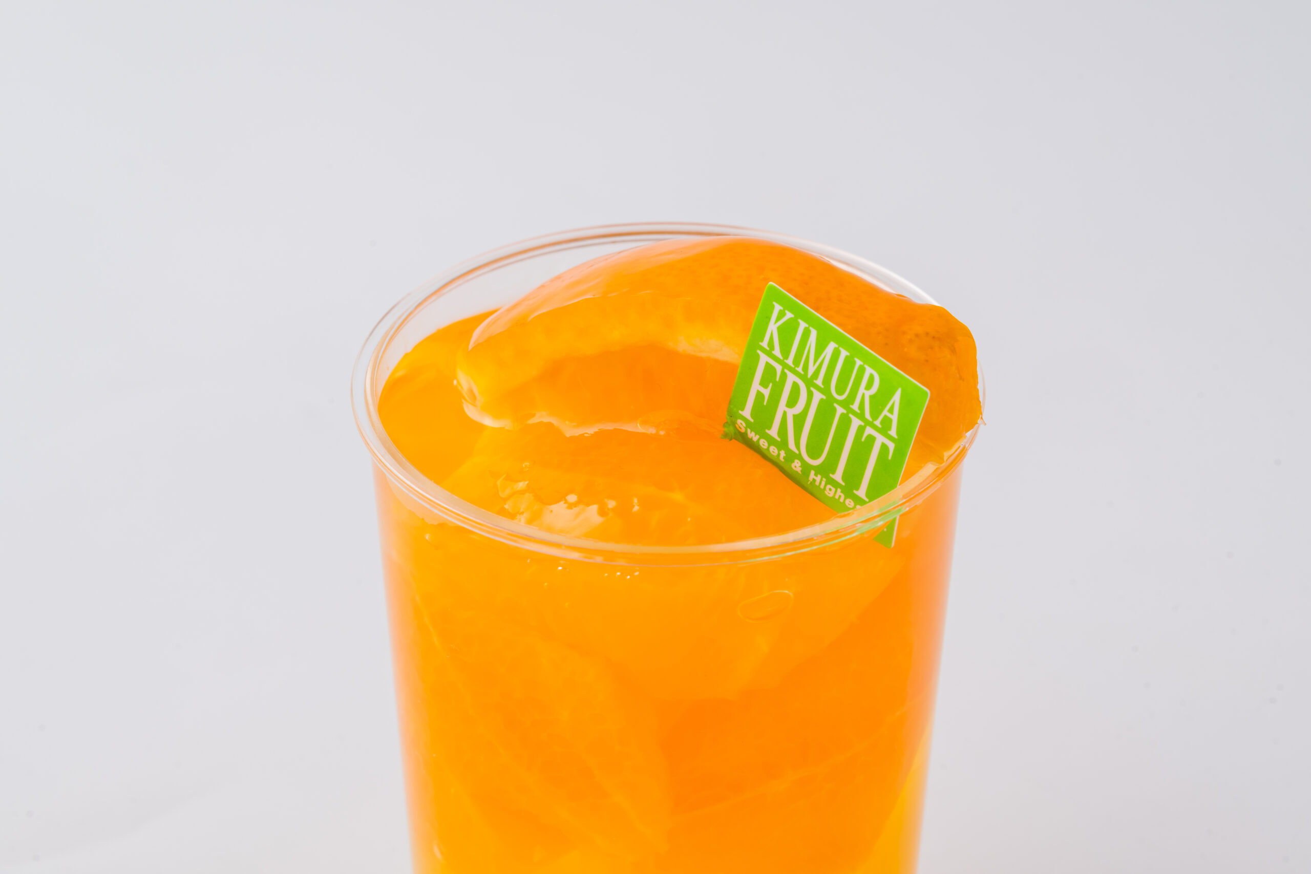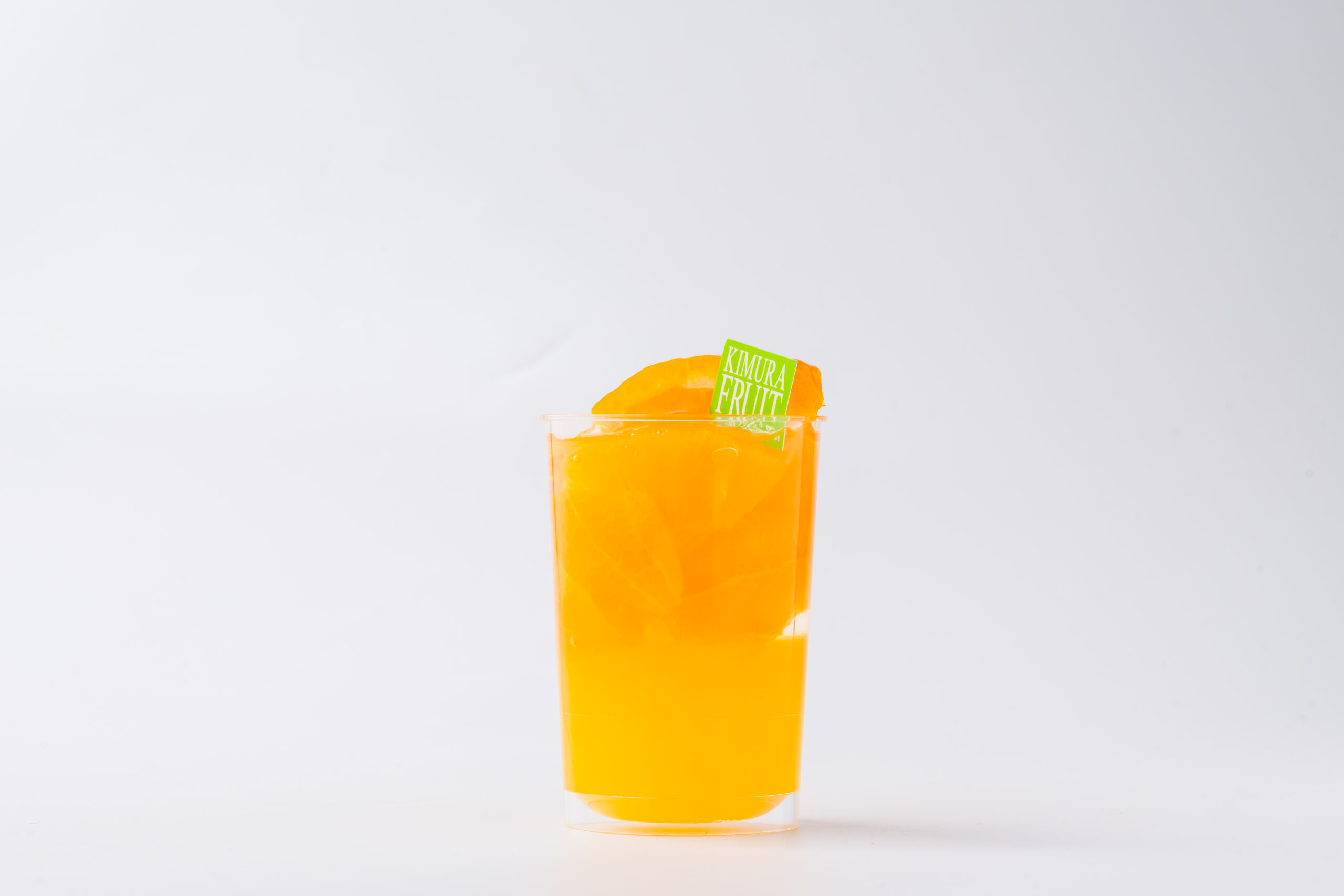 みかんピューレのゼリーの層の上に、ジューシーで濃厚なでこぽんを、さっぱりフルーティーなゼリーにごろっとお入れしました。