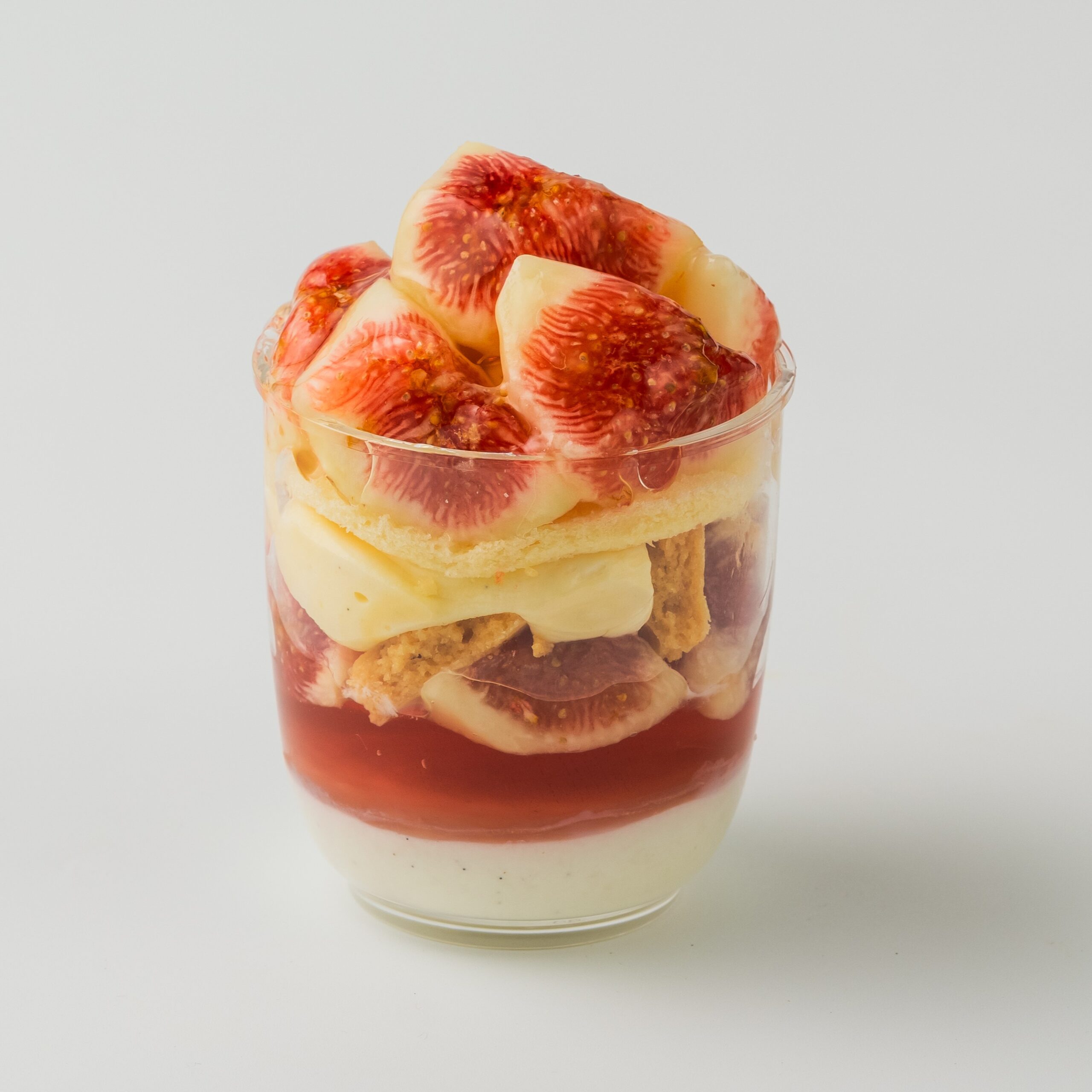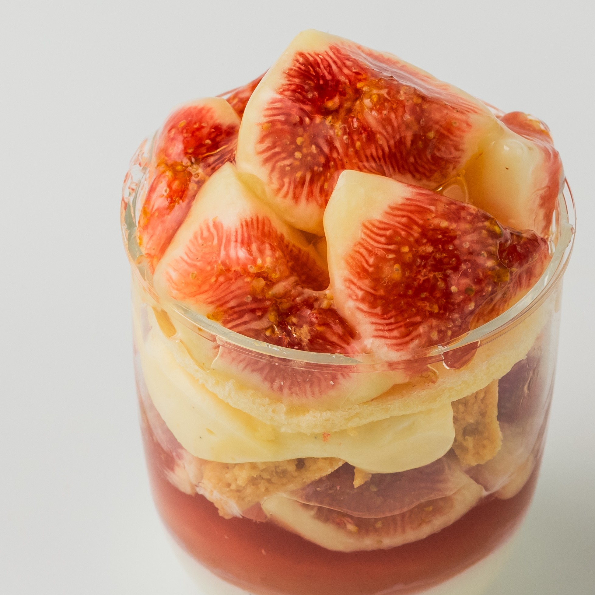 その日毎に見極めた美味しい産地のねっとり濃い甘さの「いちじく」の下に、カスタードクリーム、スポンジ、クラッシュクッキー、生クリーム、いちじくゼリー、パンナコッタが層になっています。- 主なフルーツ