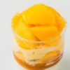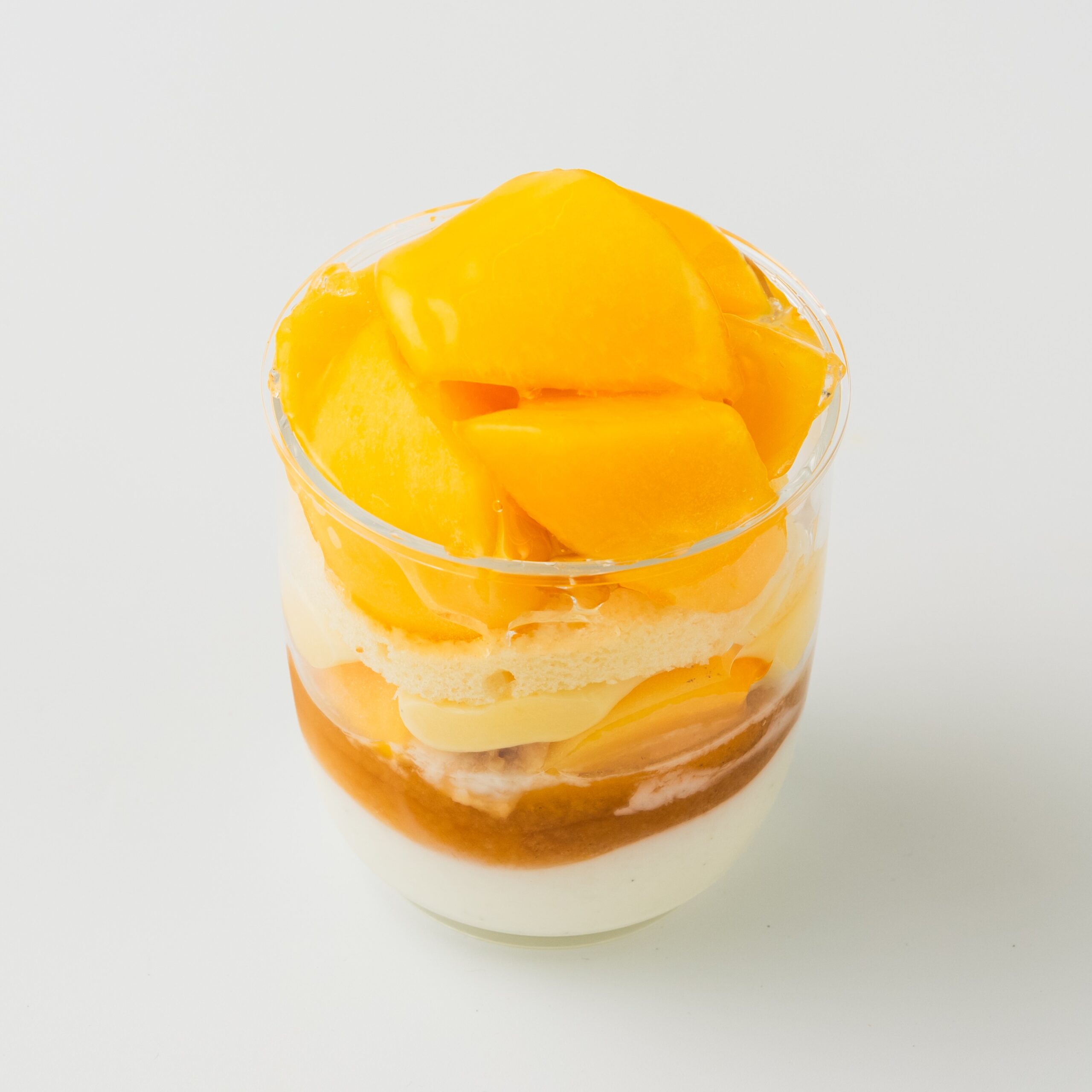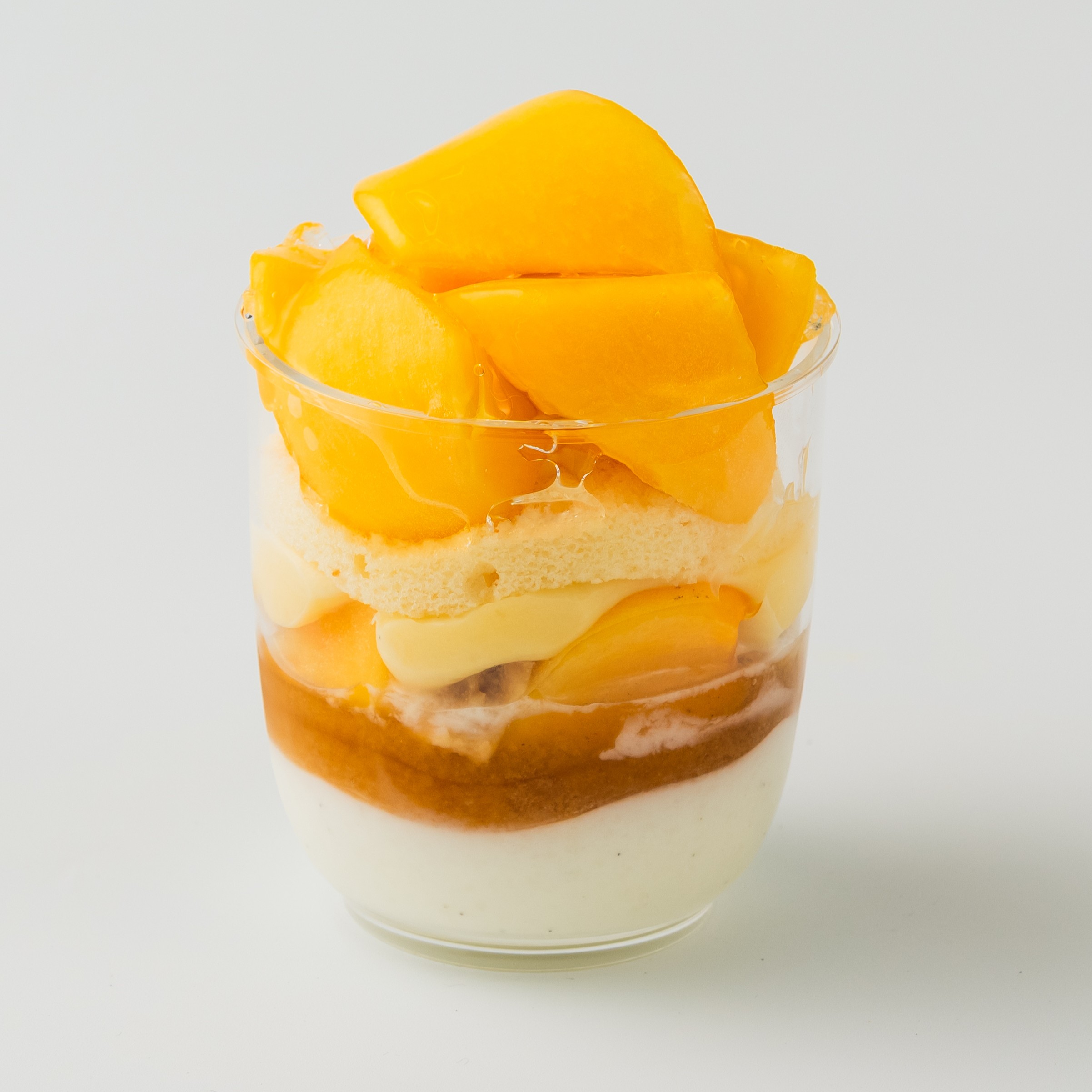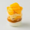 柔らかめの食感の「種なし柿」の下に、カスタードクリーム、スポンジ、クラッシュクッキー、生クリーム、柿ゼリー、パンナコッタが層になっています。- 主なフルーツ