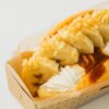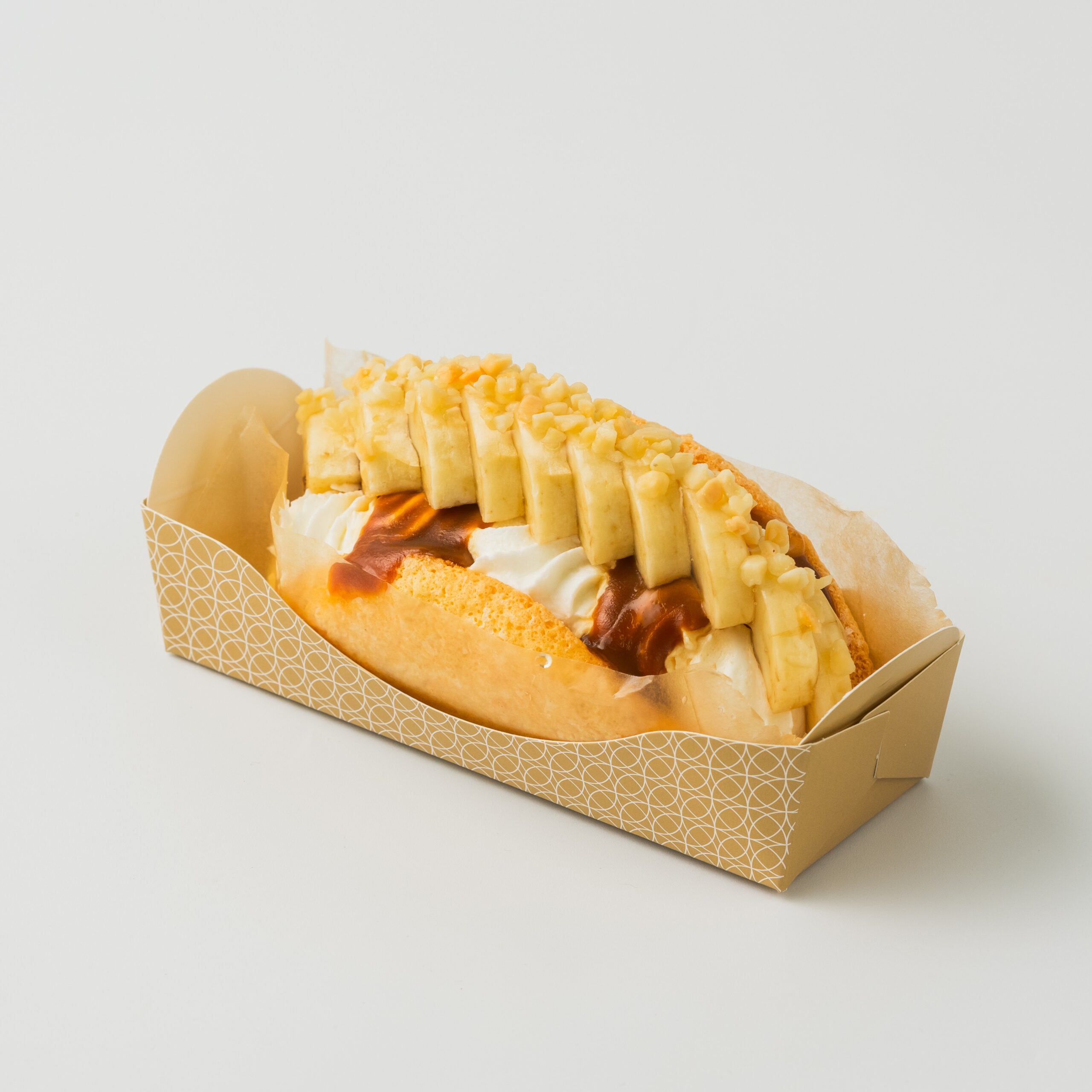 食べ頃を見極めた濃厚なバナナと自家製のキャラメルソースを、十数回の試作から選考した乳味を抑えたフルーツに合う生クリームとカスタードと一緒にどうぞ。